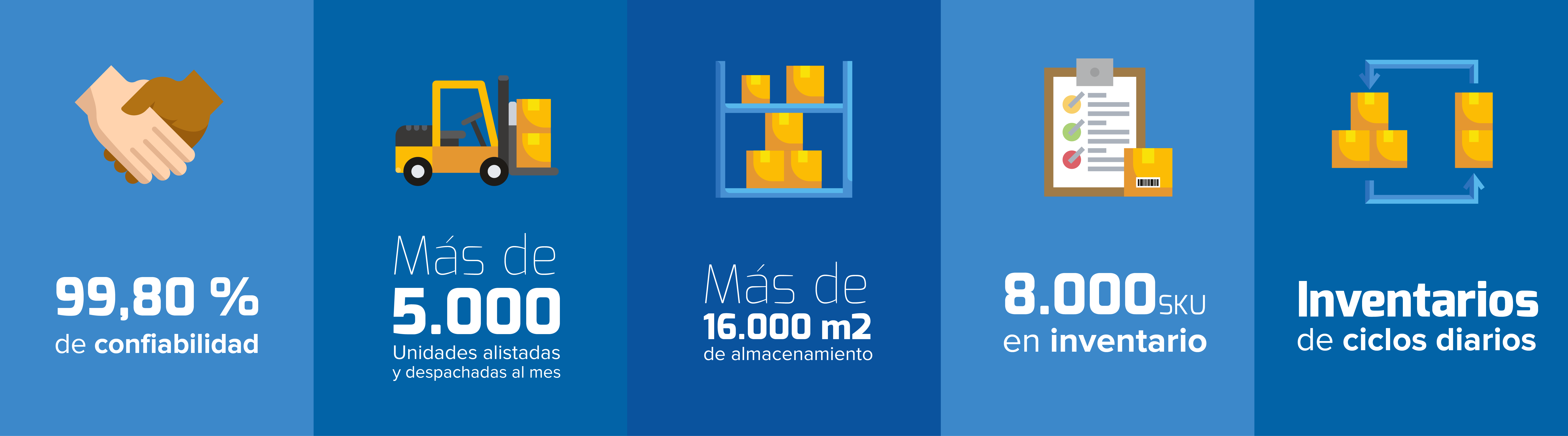 Disponemos de 16 mil metros cuadrados de bodegas de almacenamiento en las principales ciudades y puertos del país para mantener tus mercancías seguras; mediante la administración de WMS podemos controlar desde la recepción, el almacenamiento, alistamiento, despacho, distribución y la administración de los inventarios; el cual nos permite mantener información a detalle y continua con nuestros clientes.